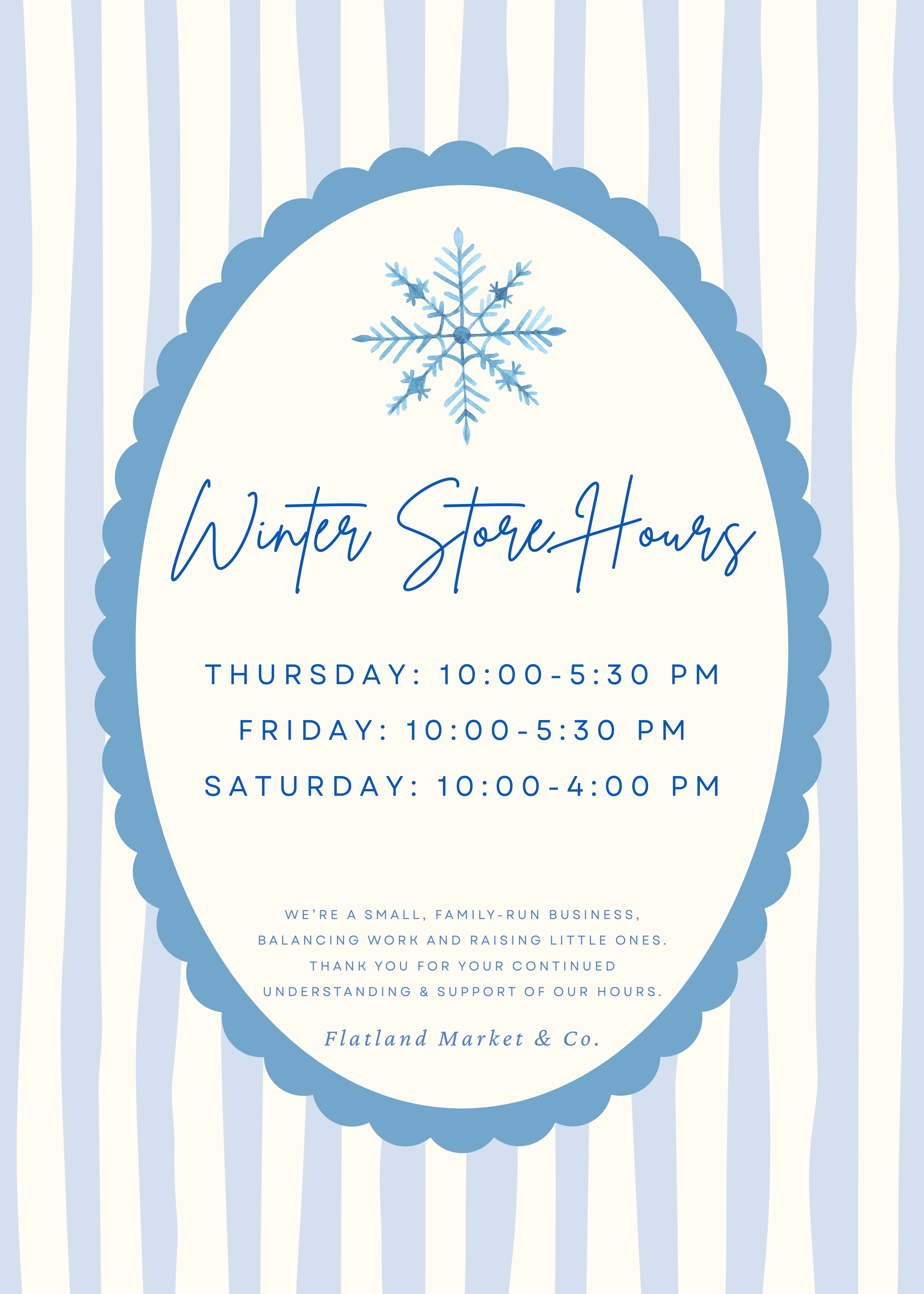 Welcome to Flatland Market & Co. We're so glad you're here! Be sure to visit us in store Thursday & Friday 10:00-5:30 and Saturday 10:00-4:00